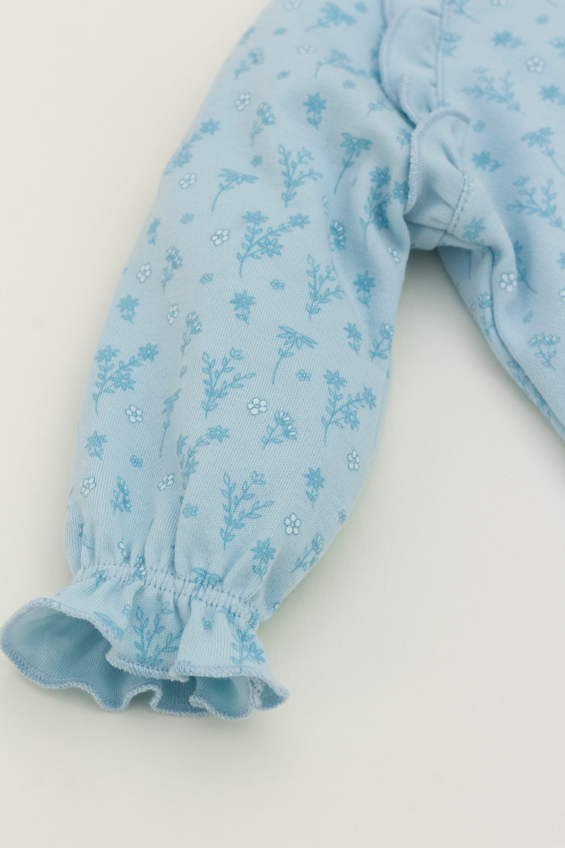 This light blue romper features long sleeves and a charming flower print, crafted from soft organic cotton to ensure gentle comfort for your baby’s delicate skin. Its breathable, natural fabric makes it an ideal choice for everyday wear, combining style and functionality seamlessly. An expert pick for a sustainable, adorable addition to your baby’s wardrobe.