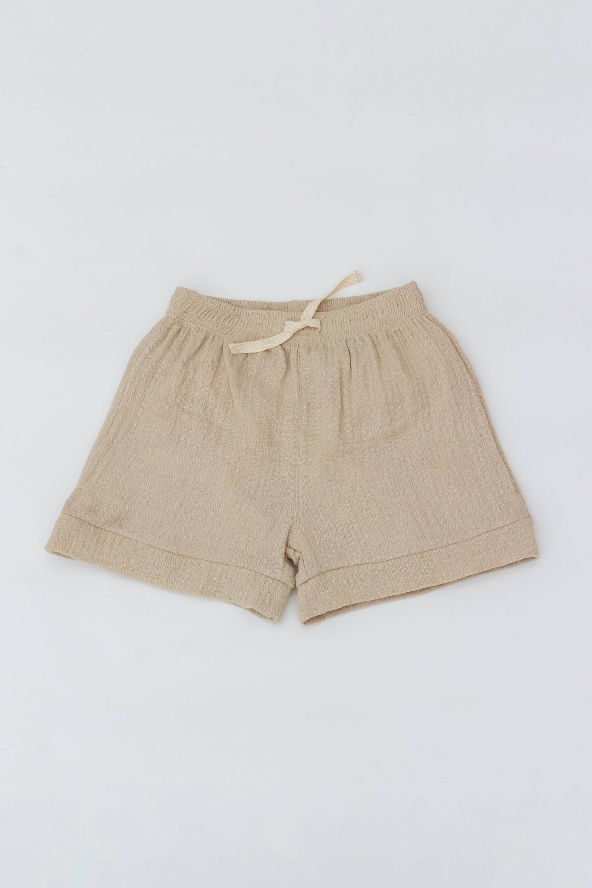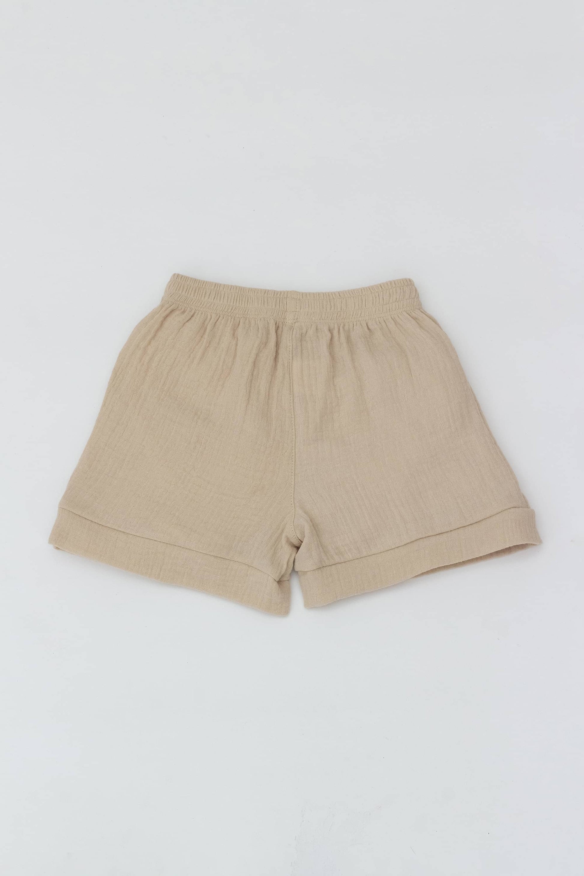 Muslin shorts featuring an elasticized waist with faux drawstring.