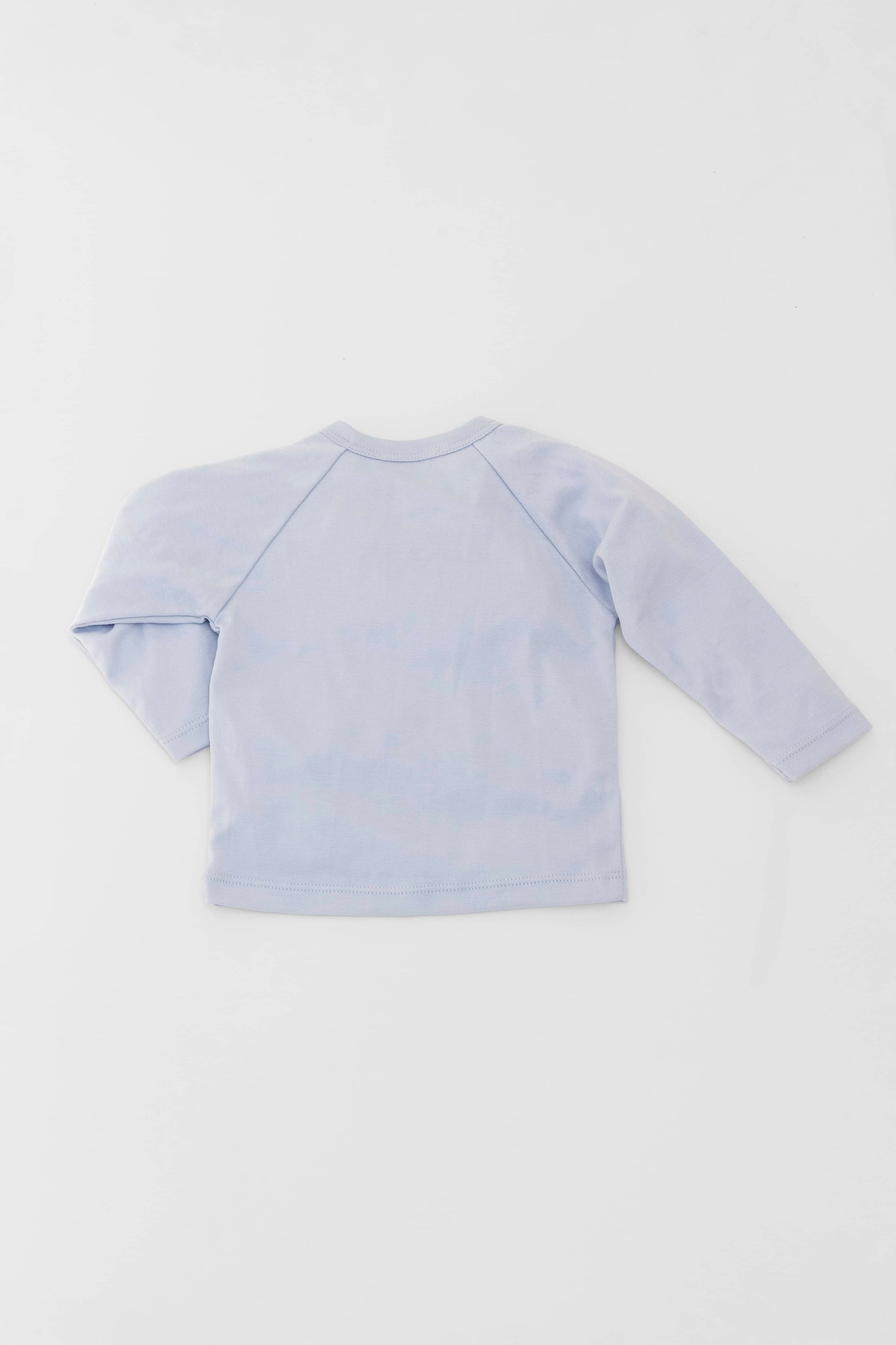 Crew neck top with buttons at raglan sleeve for easy over-the-head. Elephant print at front